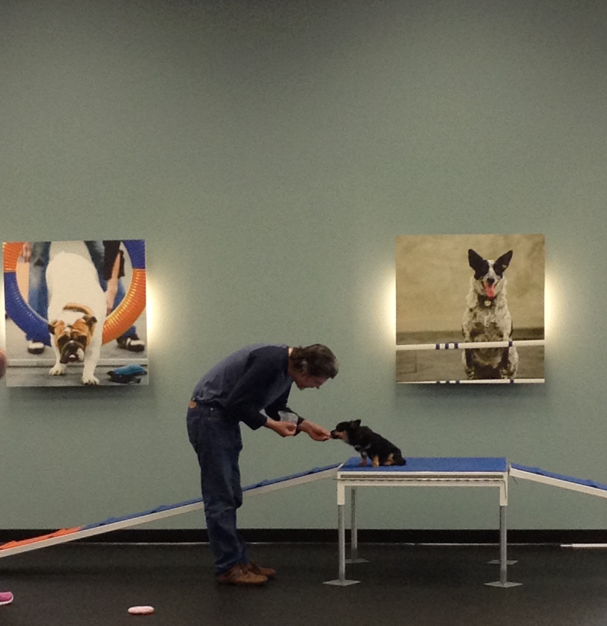 The word Chakotay means “Man who walks the Earth, but looks to the Sky”. It seems very appropriate for this little guy as he is small in stature and close to the earth, but he loves climbing and being up high toward the sky. He has really taken to agility class. Although everything is kept very low since he is still a puppy, he has no problem going over the once scary A-frame and through the tunnel that he would only go through if Mom was at the other end. Now he loves to run through all the obstacles on his own and often stands at the highest point just enjoying the view.