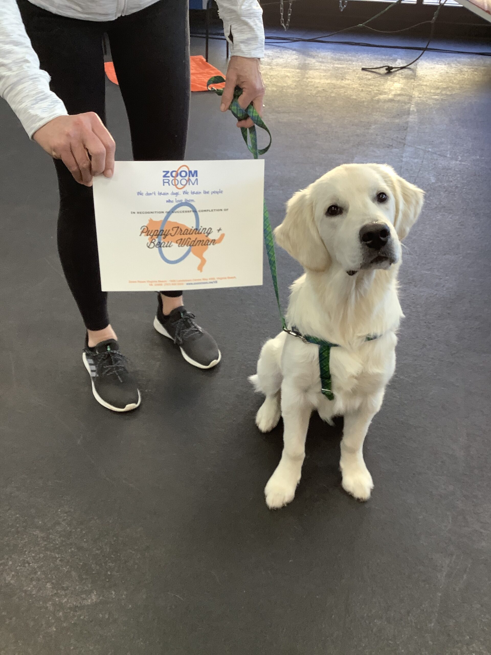 Congratulations Beau on graduating Puppy Training+! Check out this great photo of Beau, one of the amazing dogs who train at the Zoom Room indoor dog training gym in Virginia Beach.