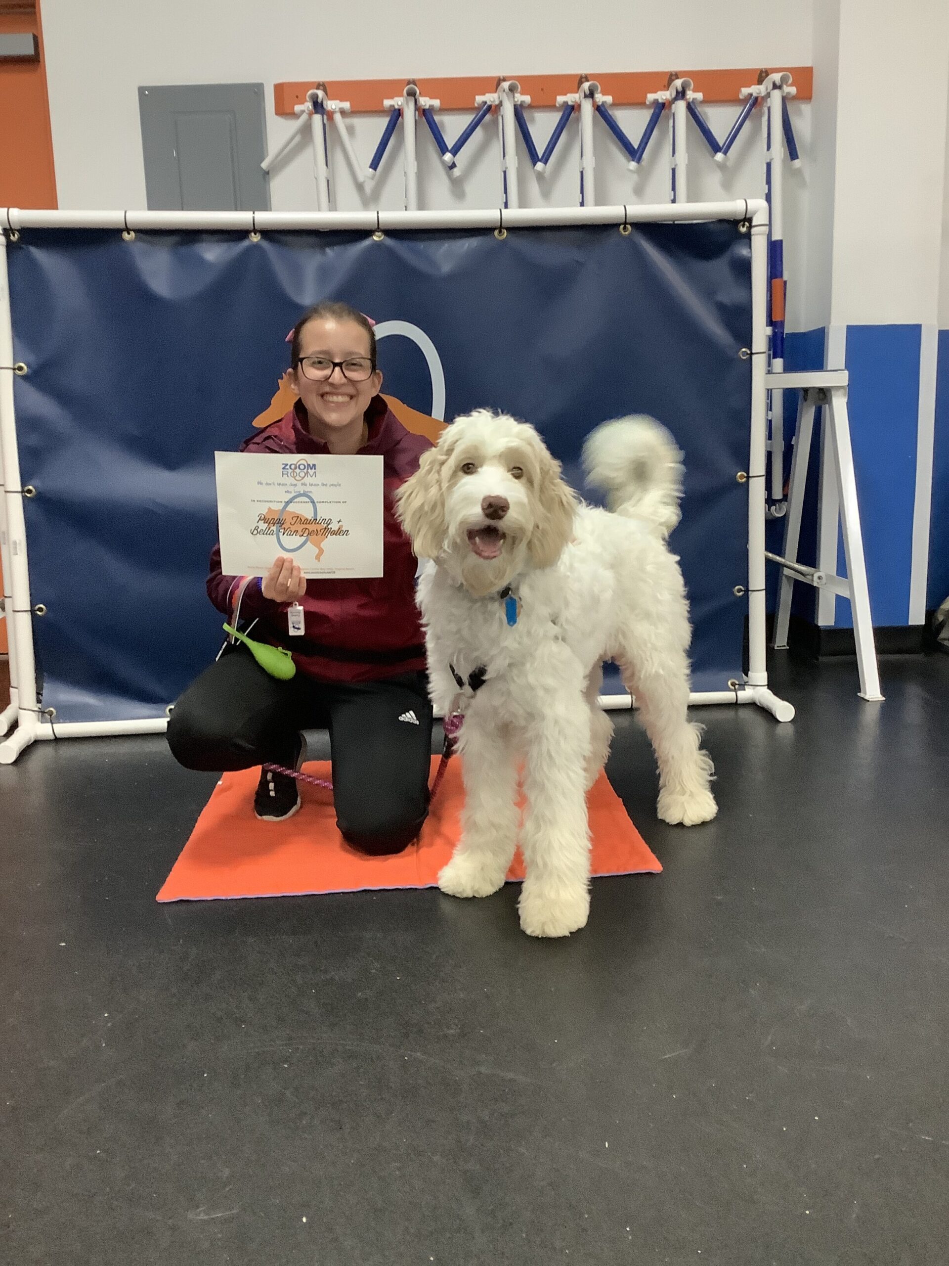 Congratulations Bella! Check out this great photo of Bella, one of the amazing dogs who train at the Zoom Room indoor dog training gym in Virginia Beach.