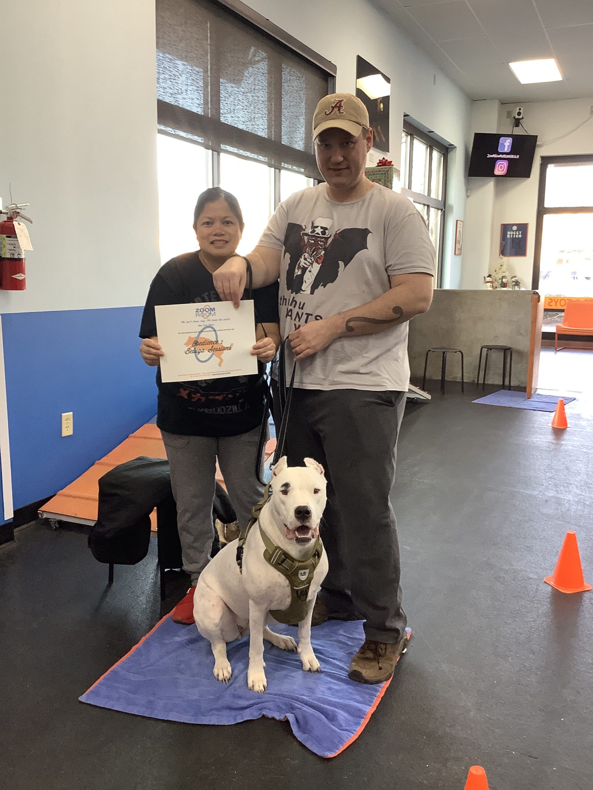 Congratulations Beluga! Check out this great photo of Beluga, one of the amazing dogs who train at the Zoom Room indoor dog training gym in Virginia Beach.