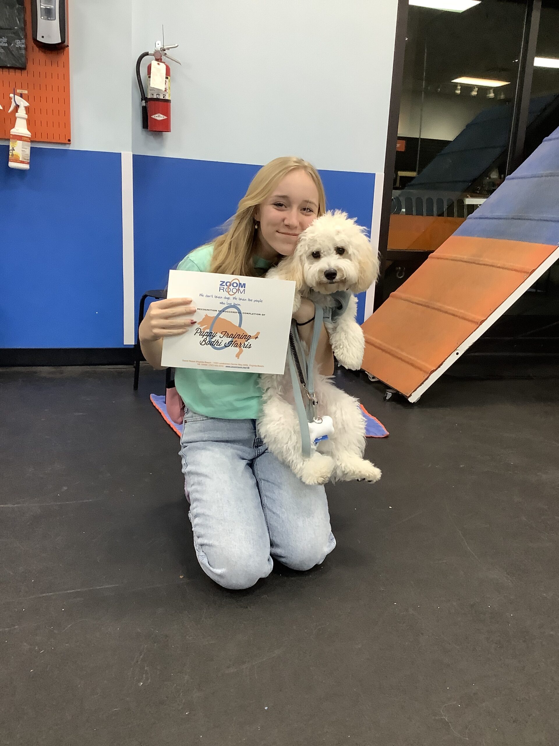 Pawtastic Job On Graduating Puppy Training + !! Check out this great photo of Bodhi, one of the amazing dogs who train at the Zoom Room indoor dog training gym in Virginia Beach.