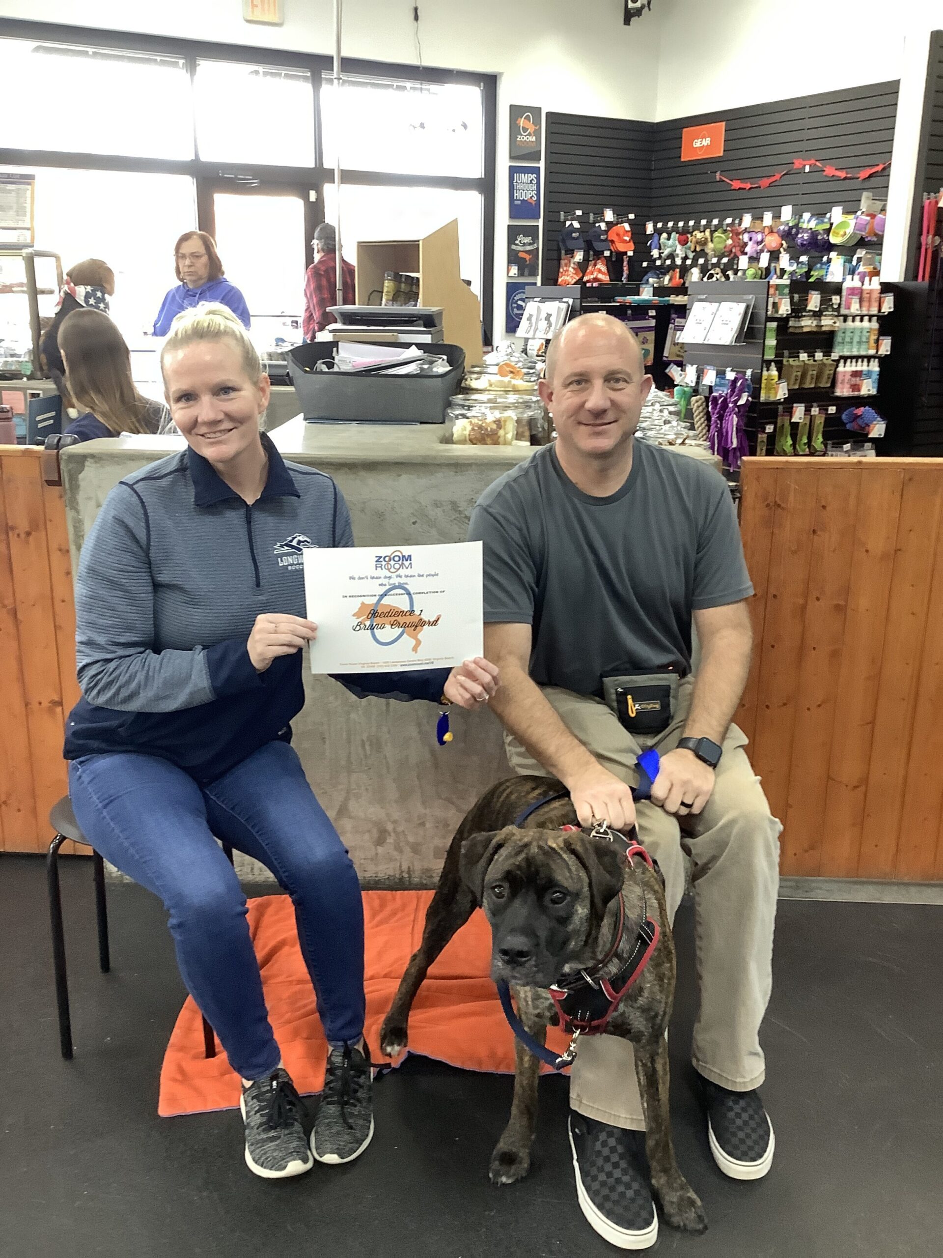 Congratulations Bruno! Check out this great photo of Bruno, one of the amazing dogs who train at the Zoom Room indoor dog training gym in Virginia Beach.