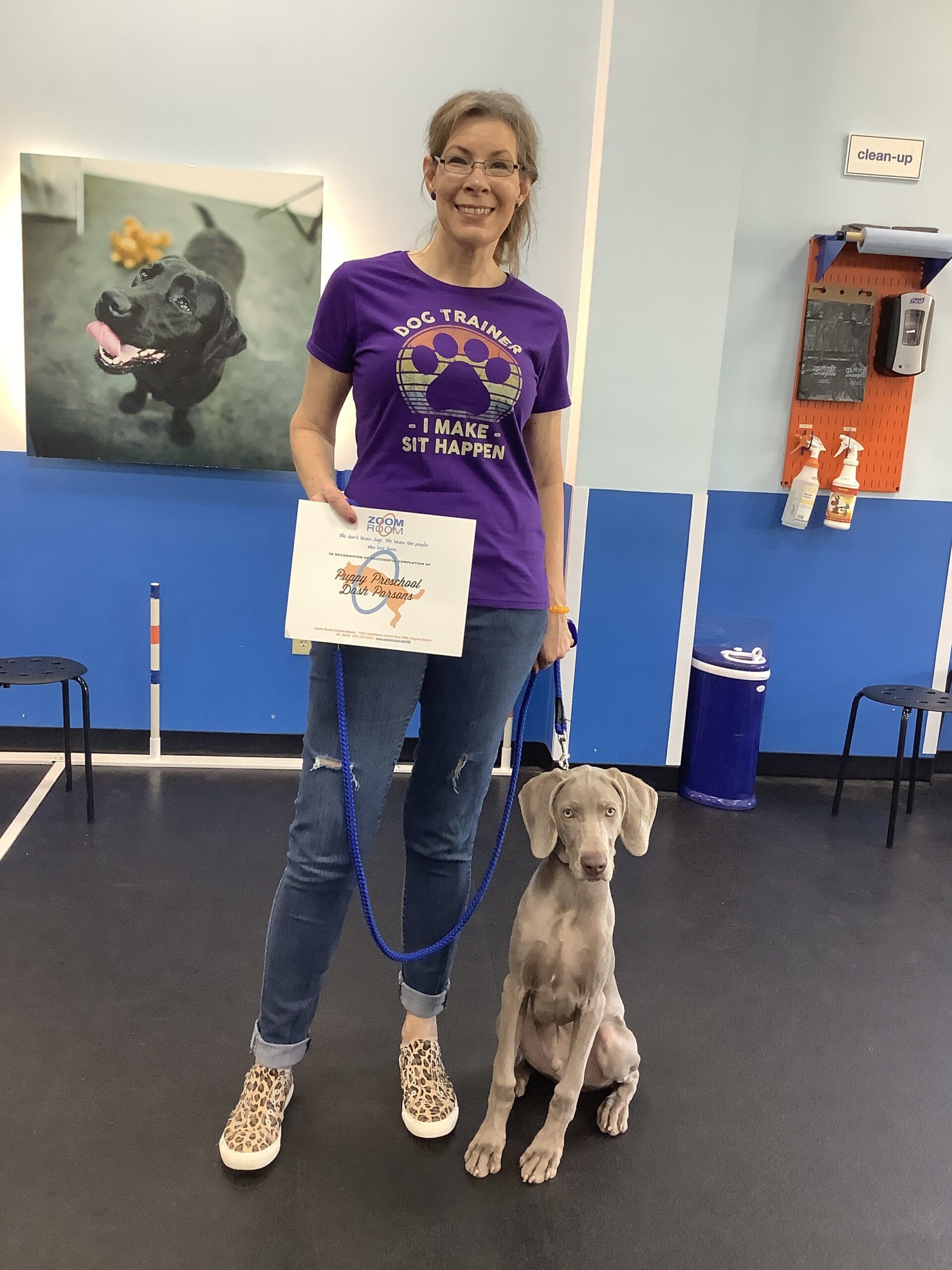 Congratulations!! Check out this great photo of Dash, one of the amazing dogs who train at the Zoom Room indoor dog training gym in Virginia Beach.