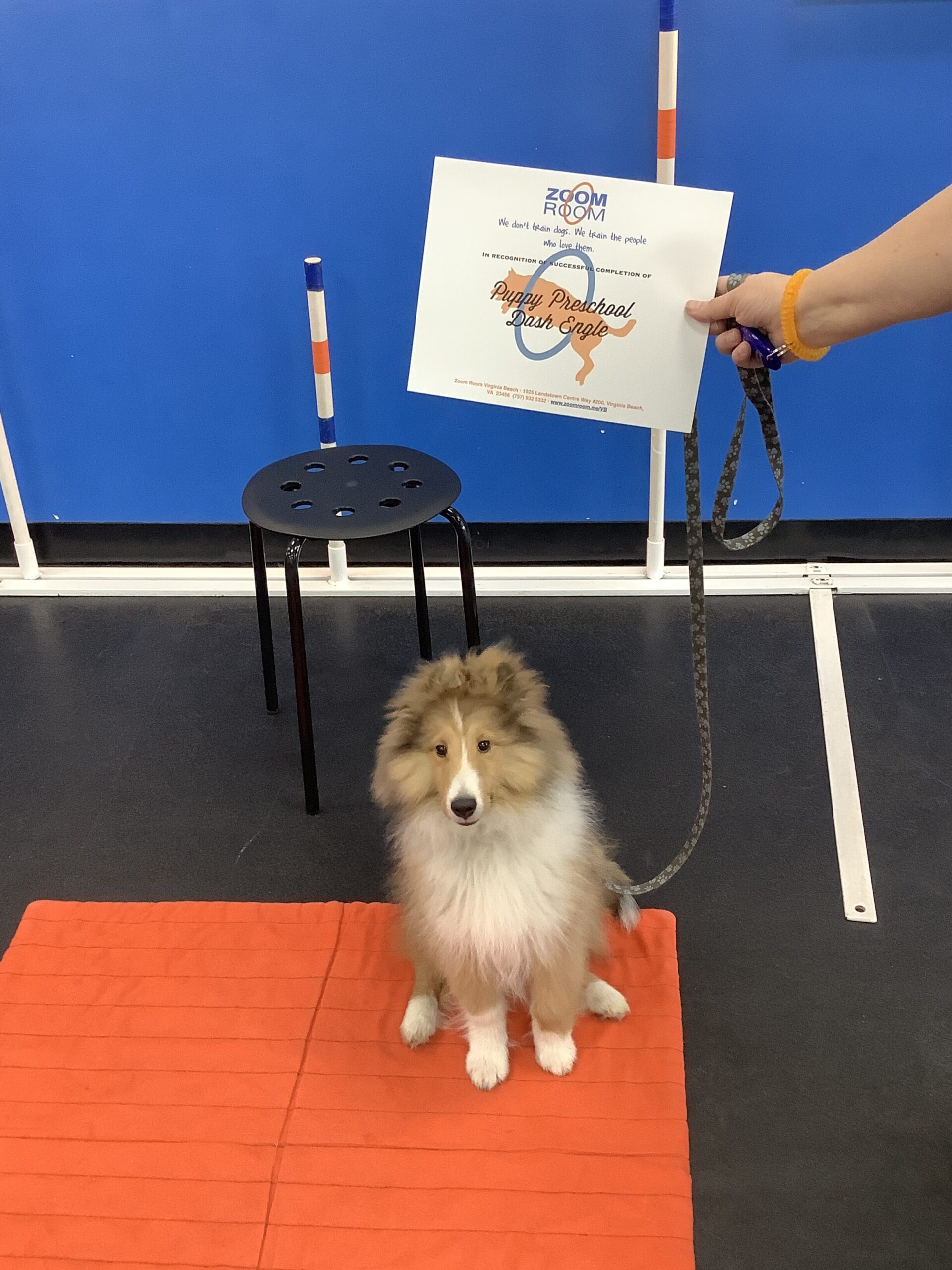 Congratulations Dash on graduating Puppy Preschool! Check out this great photo of Dash, one of the amazing dogs who train at the Zoom Room indoor dog training gym in Virginia Beach.