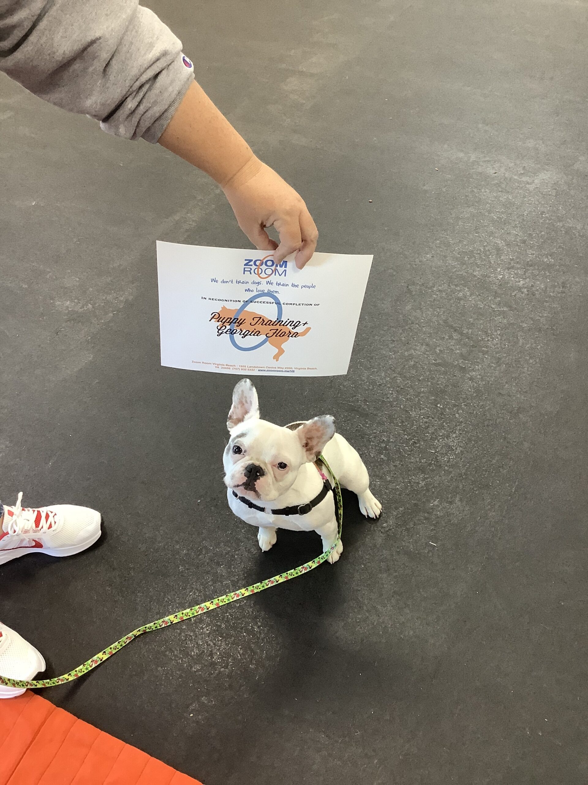 Congratulations Georgia on graduating Puppy Training+! Check out this great photo of Georgia, one of the amazing dogs who train at the Zoom Room indoor dog training gym in Virginia Beach.
