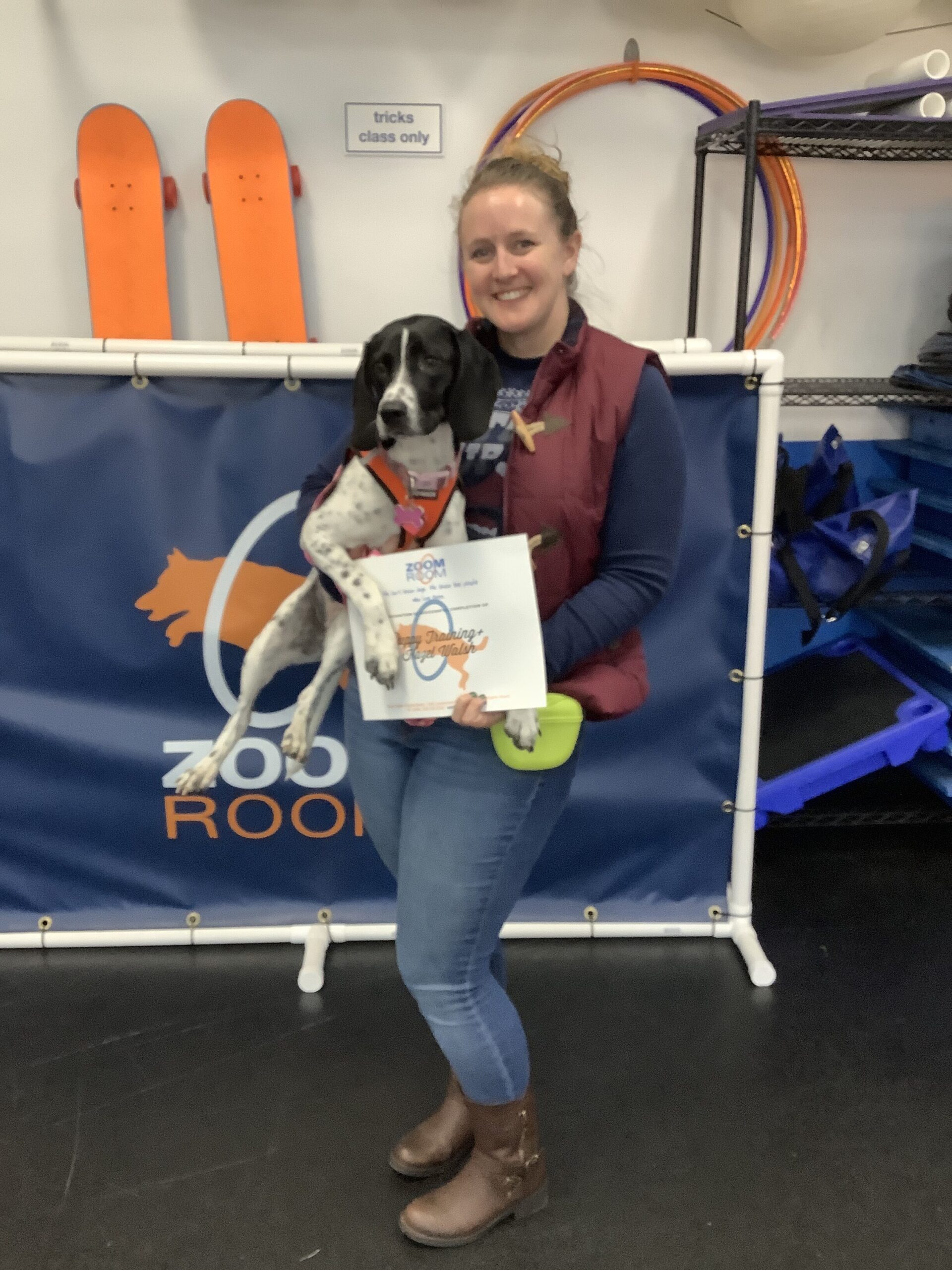 Congratulations Hazel! Check out this great photo of Hazel, one of the amazing dogs who train at the Zoom Room indoor dog training gym in Virginia Beach.