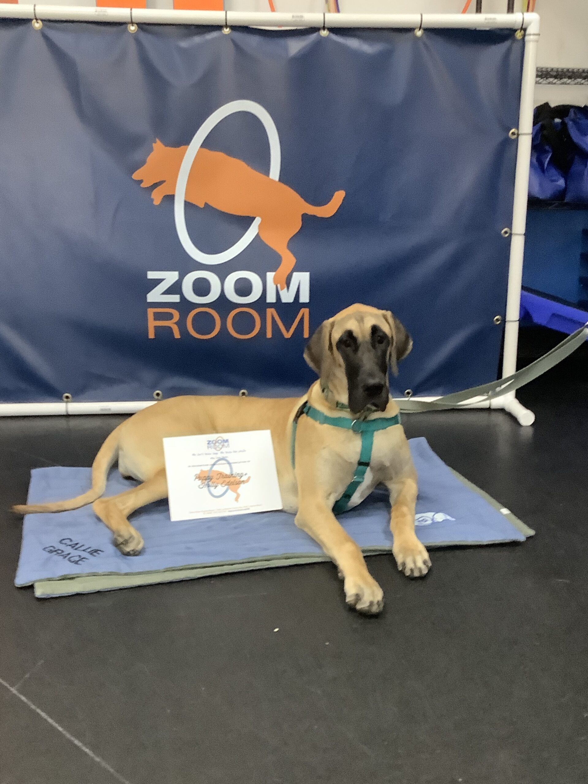 Congratulations Holly! Check out this great photo of Holly, one of the amazing dogs who train at the Zoom Room indoor dog training gym in Virginia Beach.