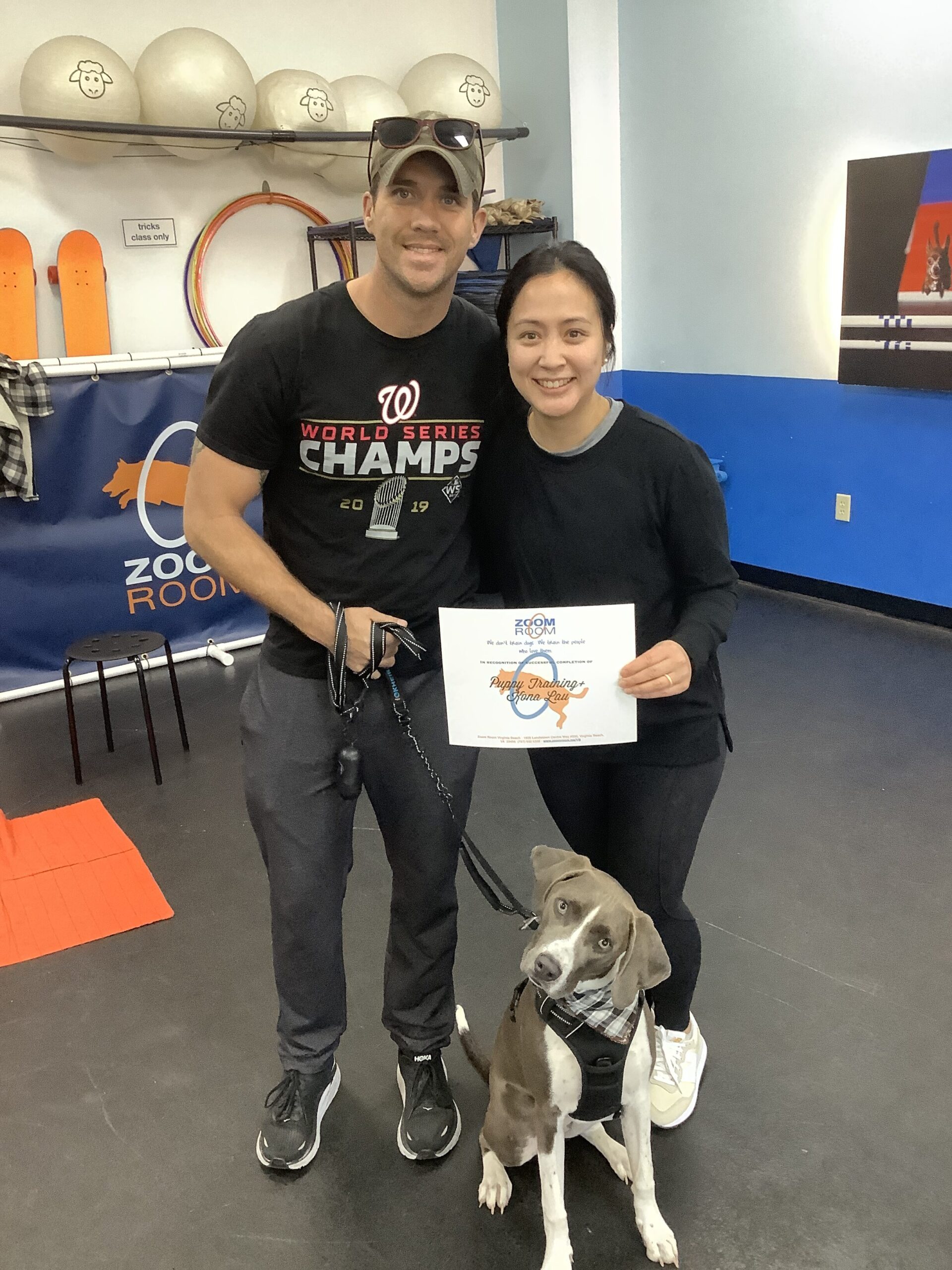 Congratulations Kona on graduating Puppy Training+! Check out this great photo of Kona, one of the amazing dogs who train at the Zoom Room indoor dog training gym in Virginia Beach.