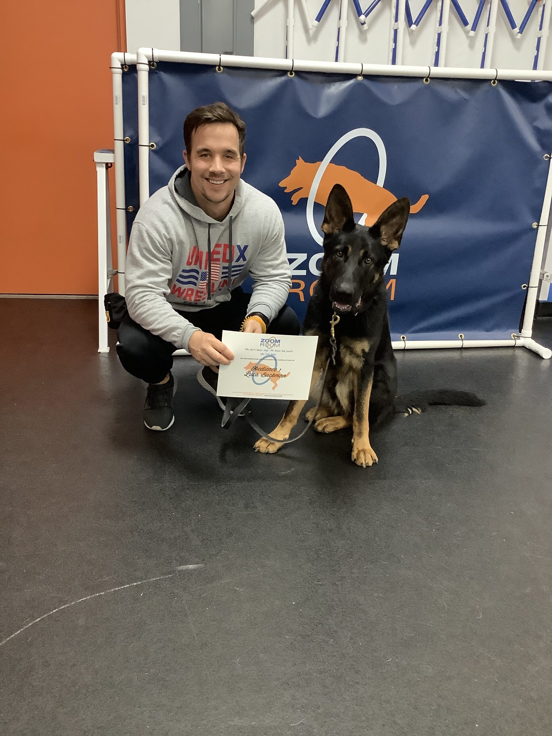 Congratulations!! Check out this great photo of Luca, one of the amazing dogs who train at the Zoom Room indoor dog training gym in Virginia Beach.