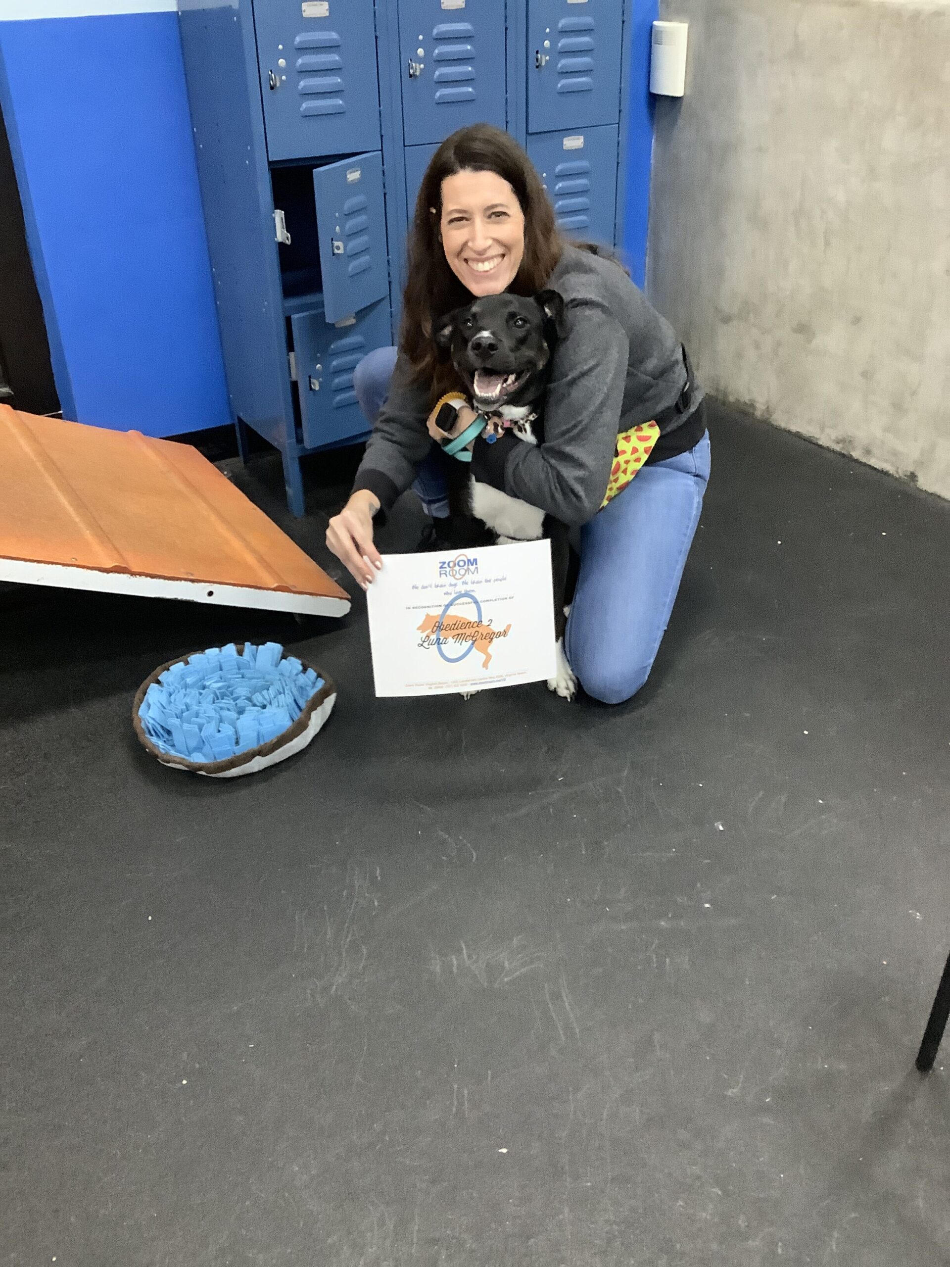 Keep up the good work with Luna! She has come so far! Check out this great photo of Luna, one of the amazing dogs who train at the Zoom Room indoor dog training gym in Virginia Beach.