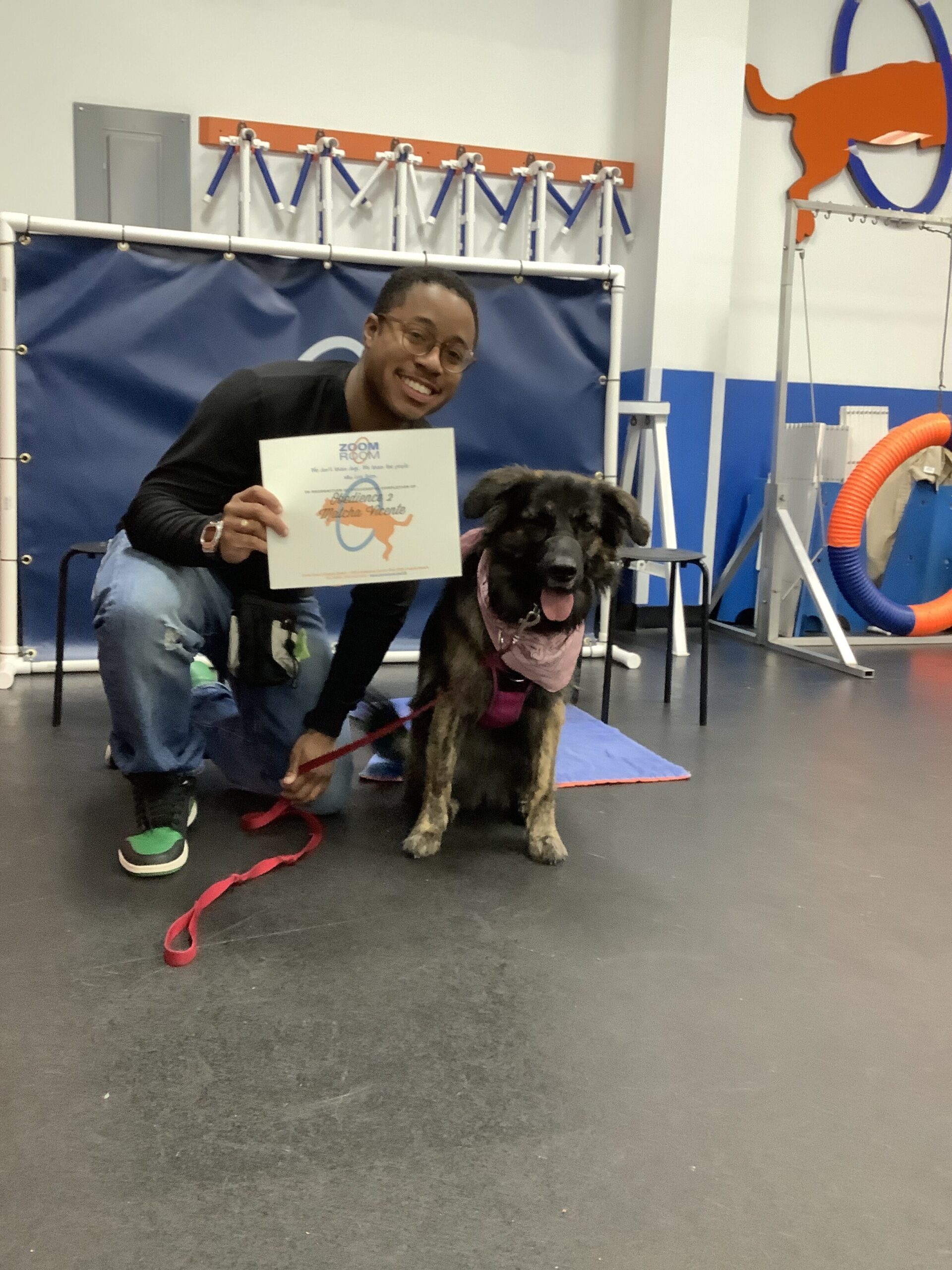 Congratulations!! Check out this great photo of Matcha, one of the amazing dogs who train at the Zoom Room indoor dog training gym in Virginia Beach.