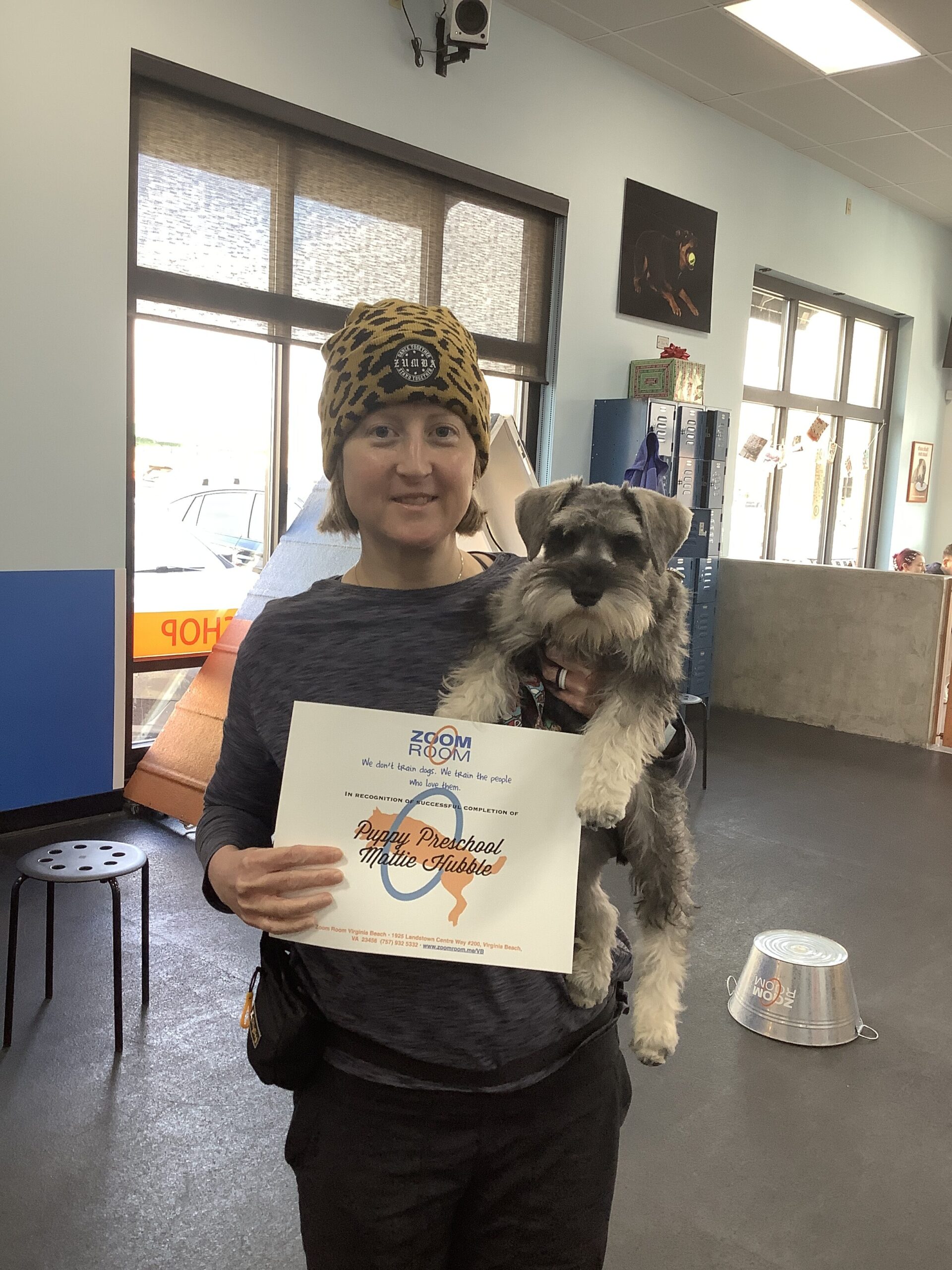 Congratulations!! Check out this great photo of Mattie, one of the amazing dogs who train at the Zoom Room indoor dog training gym in Virginia Beach.