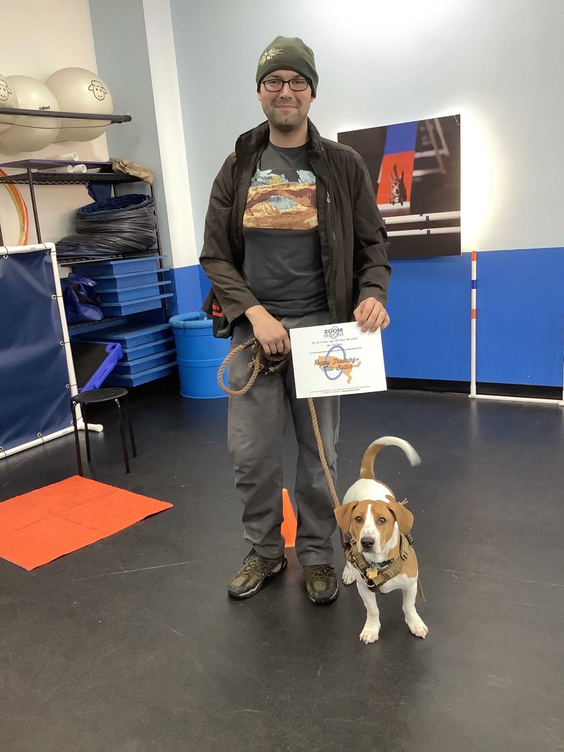 Congratulations Milo on graduating Puppy Training+! Check out this great photo of Milo, one of the amazing dogs who train at the Zoom Room indoor dog training gym in Virginia Beach.