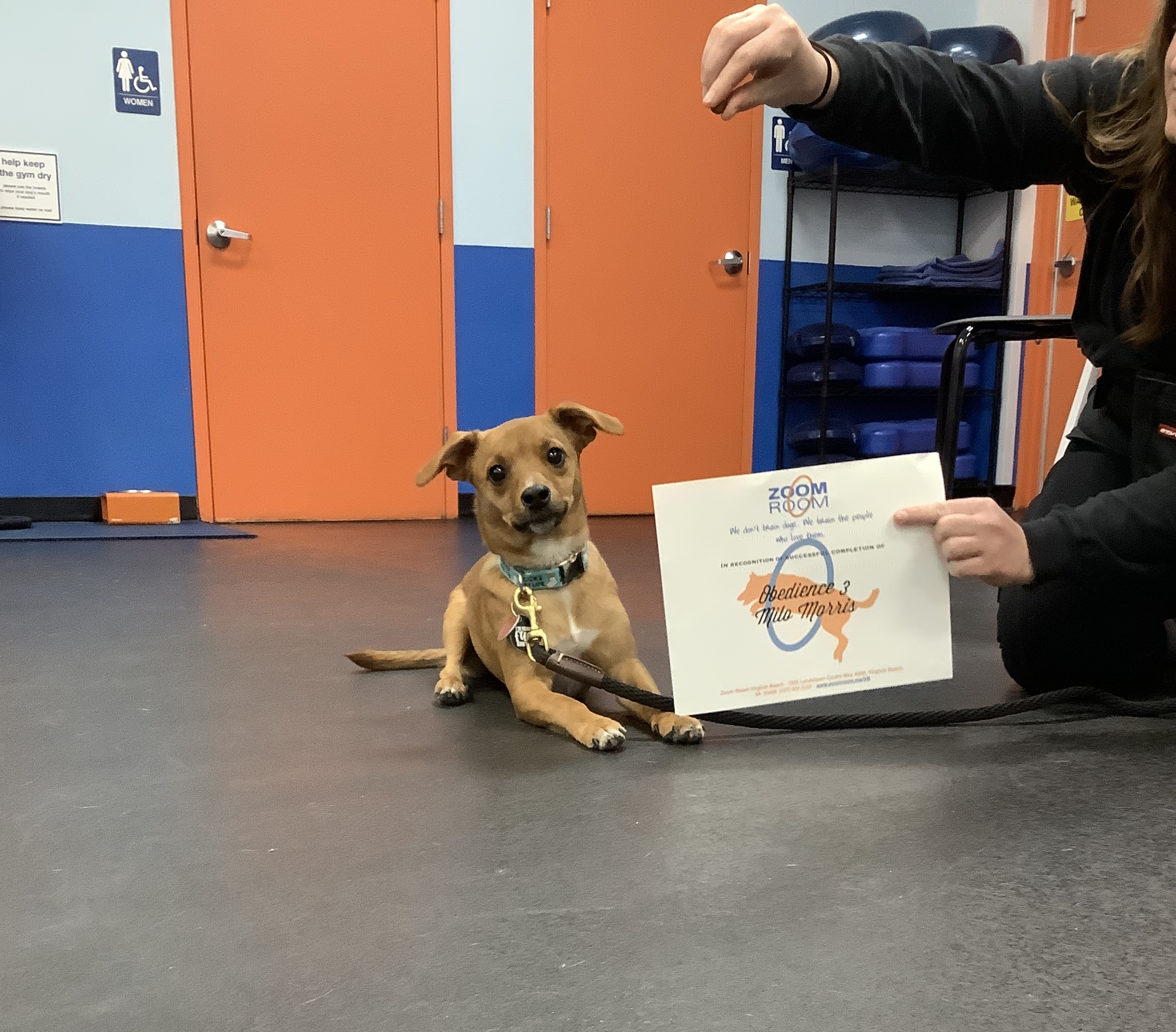Pawsome Job Graduating Obedience 3 !! Check out this great photo of Milo, one of the amazing dogs who train at the Zoom Room indoor dog training gym in Virginia Beach.