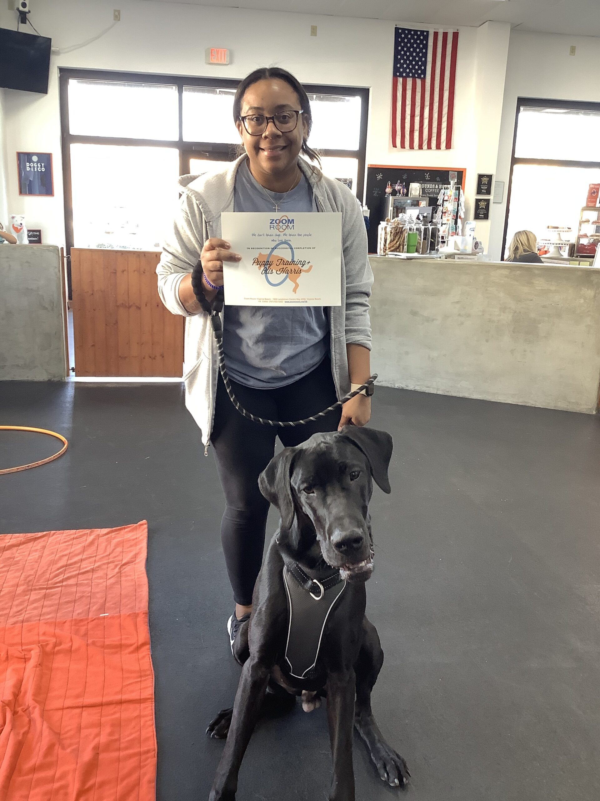 Congratulations!! Check out this great photo of Otis, one of the amazing dogs who train at the Zoom Room indoor dog training gym in Virginia Beach.