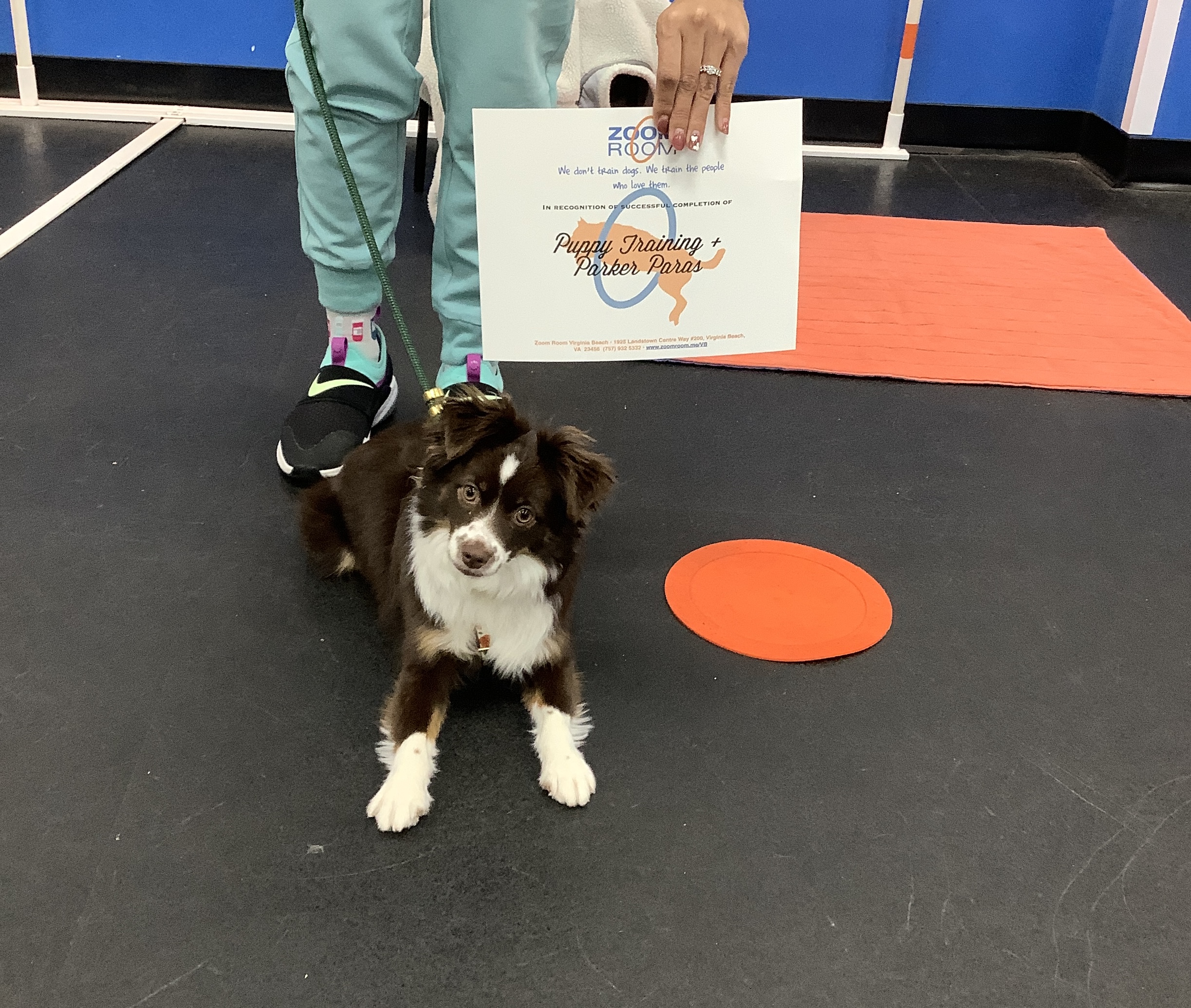 Congratulations Parker! Check out this great photo of Parker, one of the amazing dogs who train at the Zoom Room indoor dog training gym in Virginia Beach.