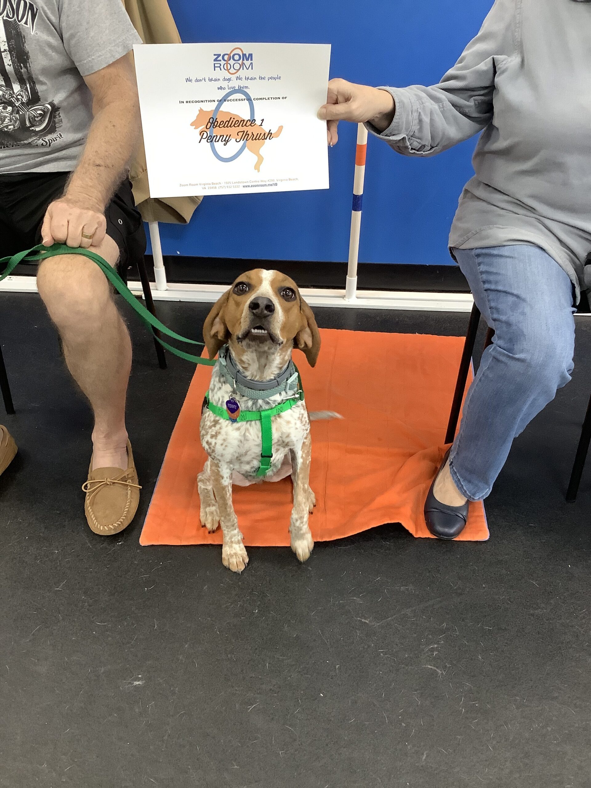 Congratulations Penny on graduating Obedience 1! Check out this great photo of Penny, one of the amazing dogs who train at the Zoom Room indoor dog training gym in Virginia Beach.