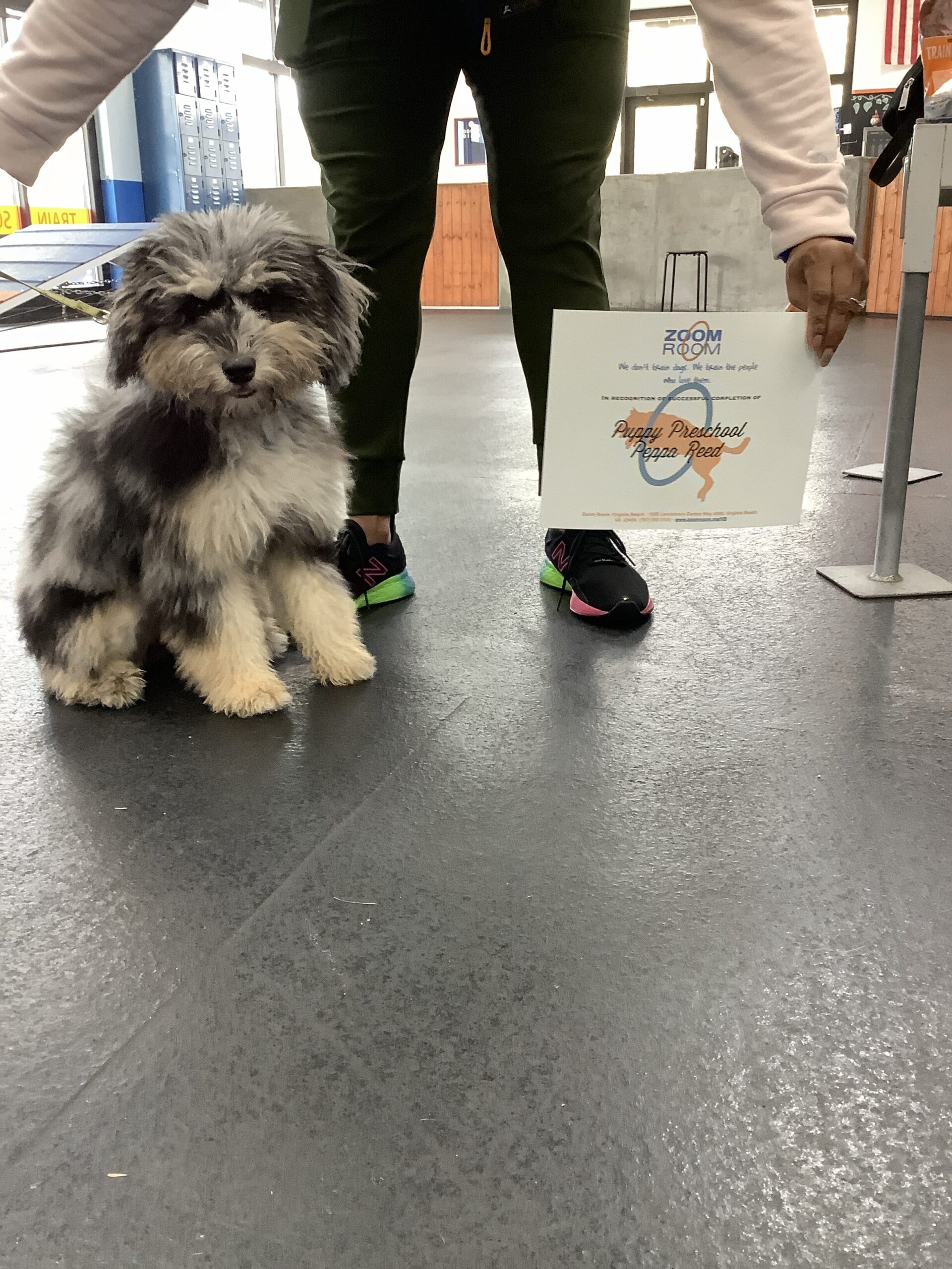 Congratulations!! Check out this great photo of Peppa, one of the amazing dogs who train at the Zoom Room indoor dog training gym in Virginia Beach.