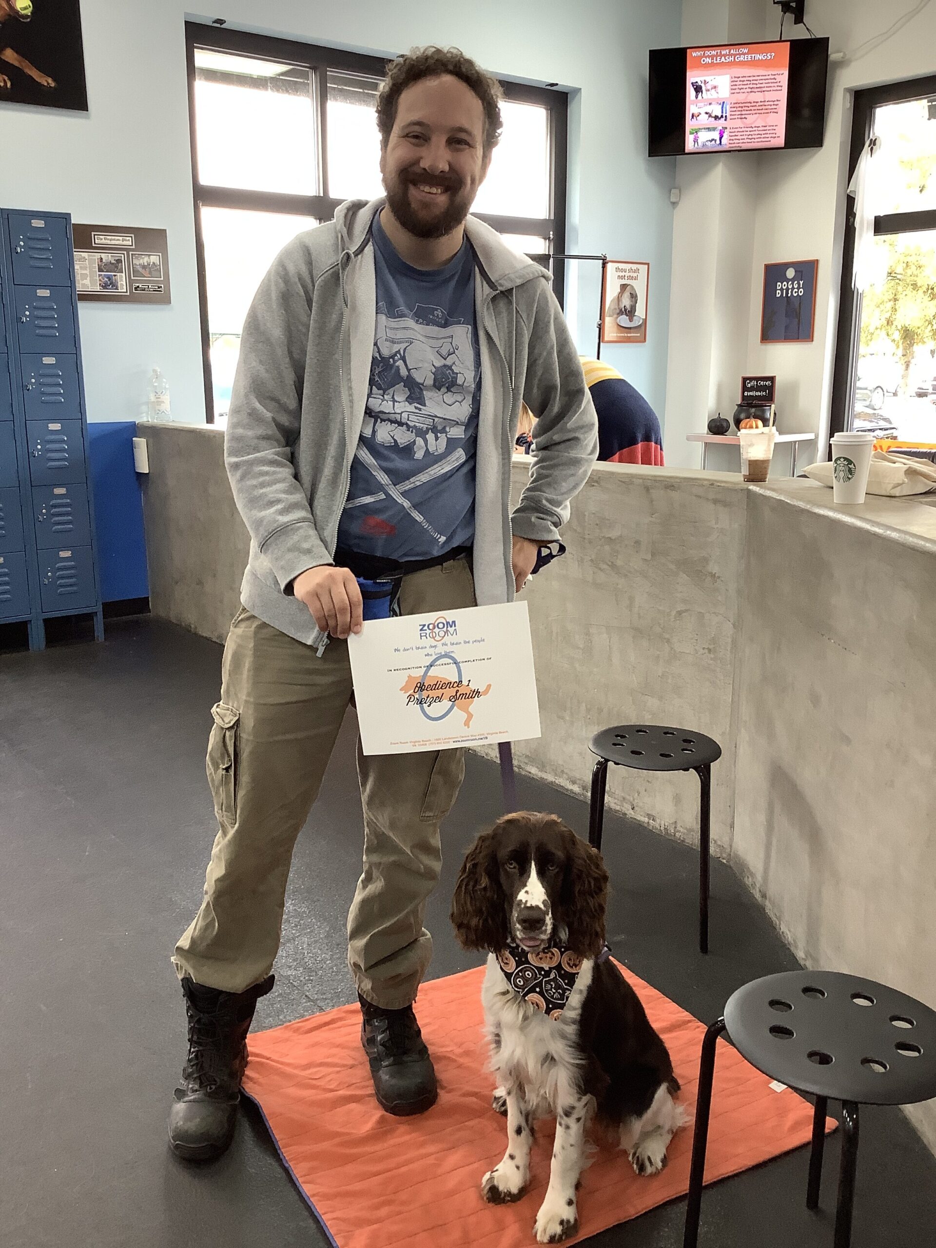 Congratulations Pretzel! Check out this great photo of Pretzel, one of the amazing dogs who train at the Zoom Room indoor dog training gym in Virginia Beach.