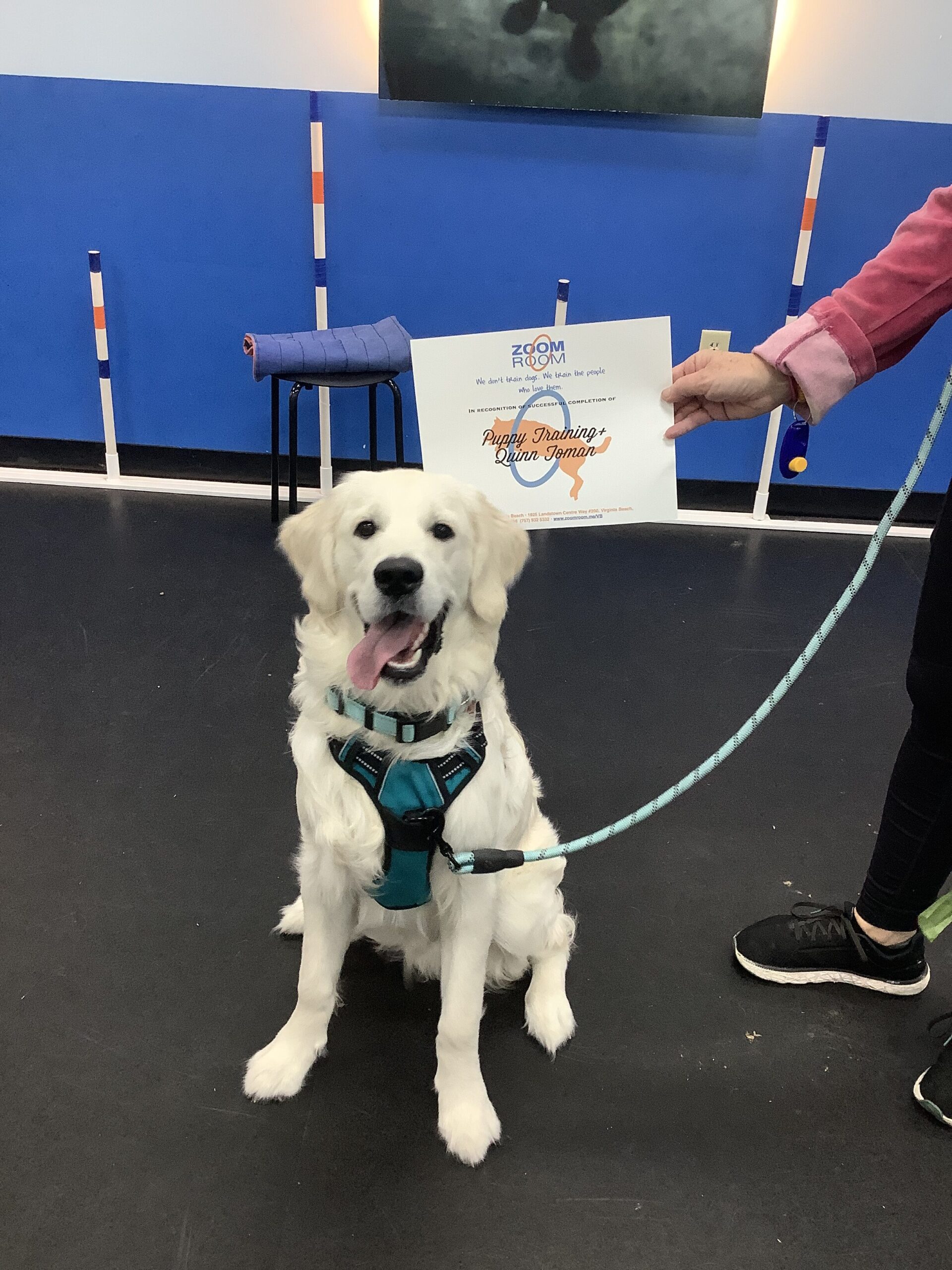 Congratulations!! Check out this great photo of Quinn, one of the amazing dogs who train at the Zoom Room indoor dog training gym in Virginia Beach.