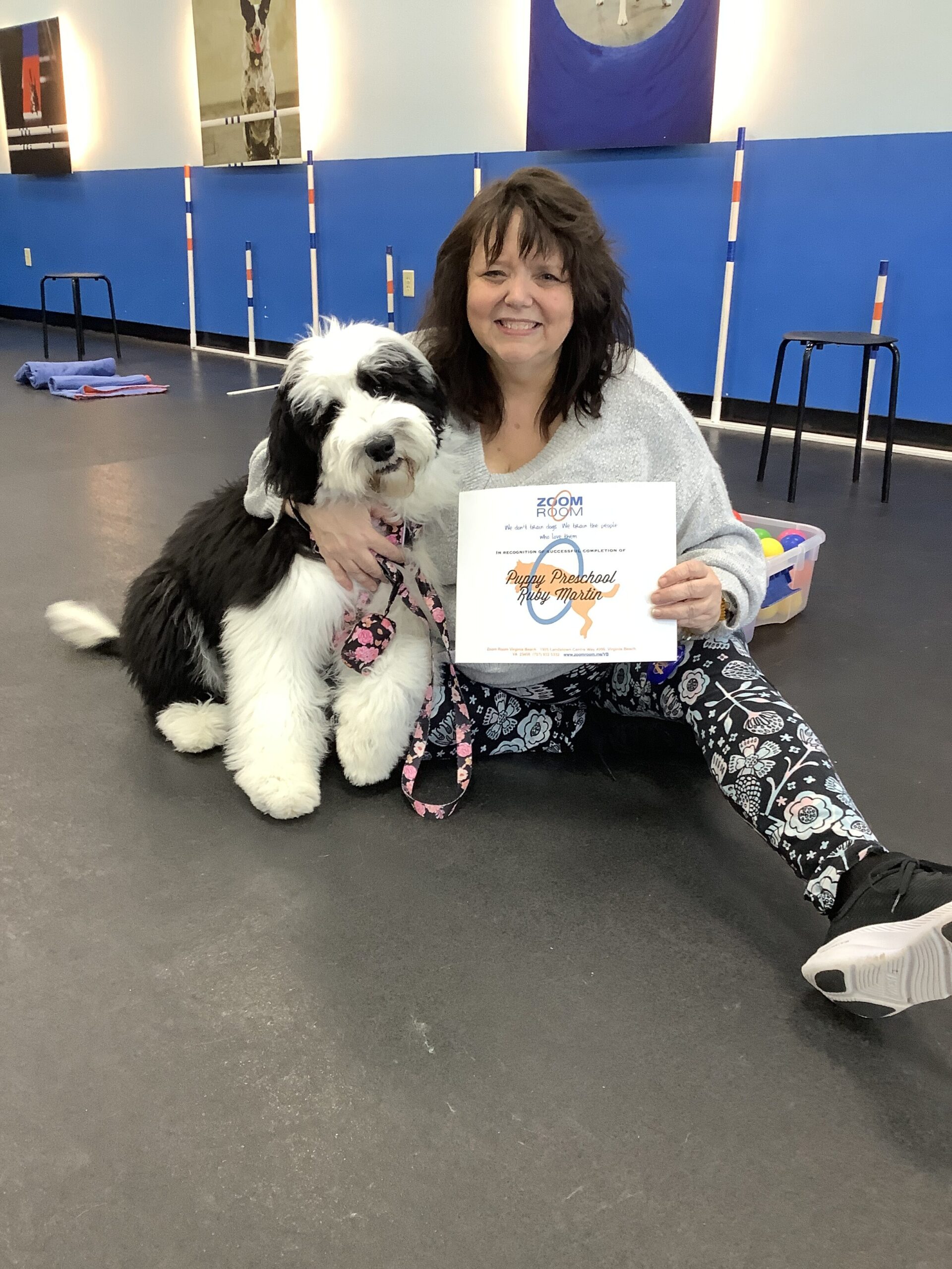 Congratulations Ruby! Check out this great photo of Ruby, one of the amazing dogs who train at the Zoom Room indoor dog training gym in Virginia Beach.