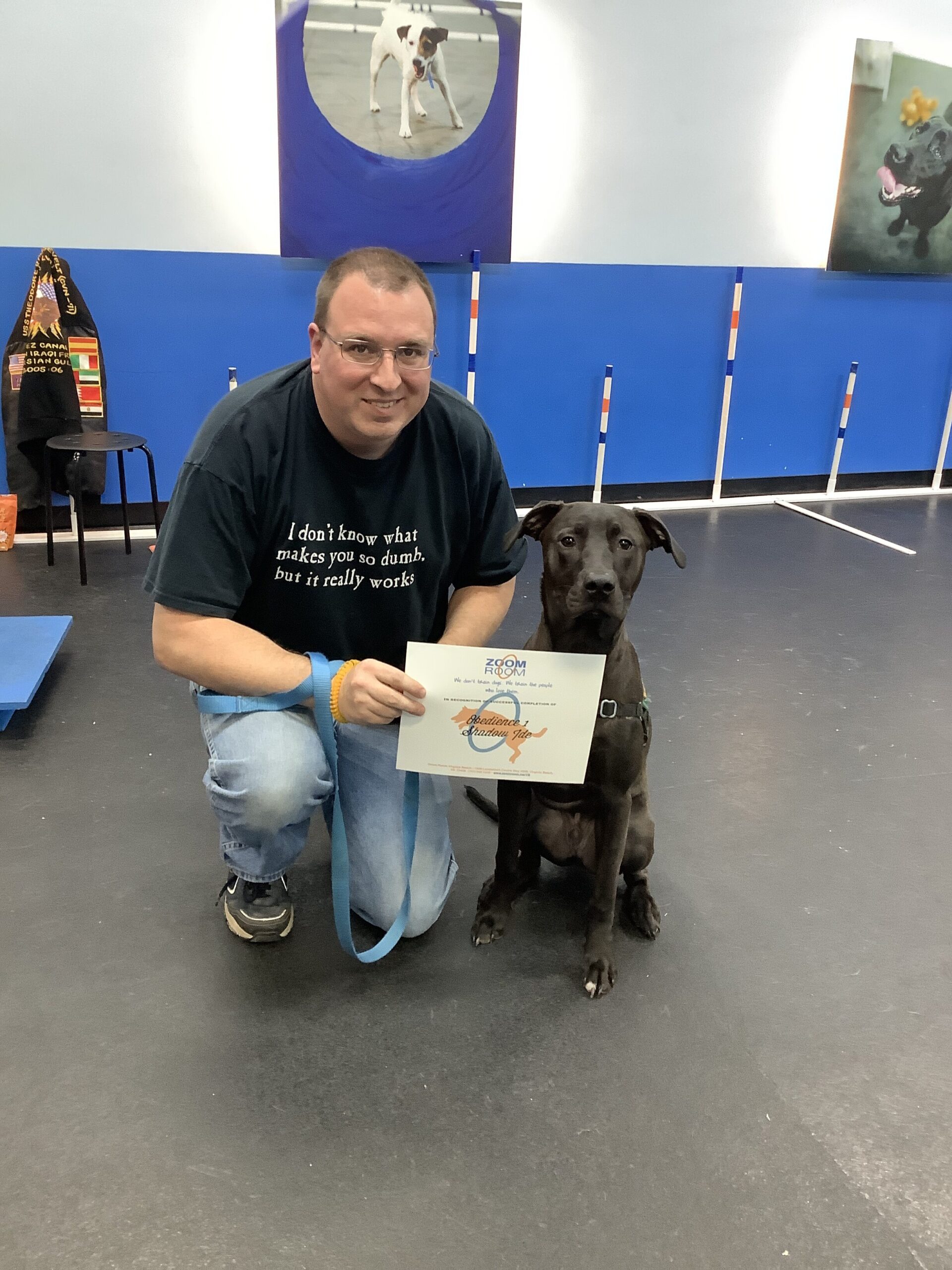 Congratulations!! Check out this great photo of Shadow, one of the amazing dogs who train at the Zoom Room indoor dog training gym in Virginia Beach.