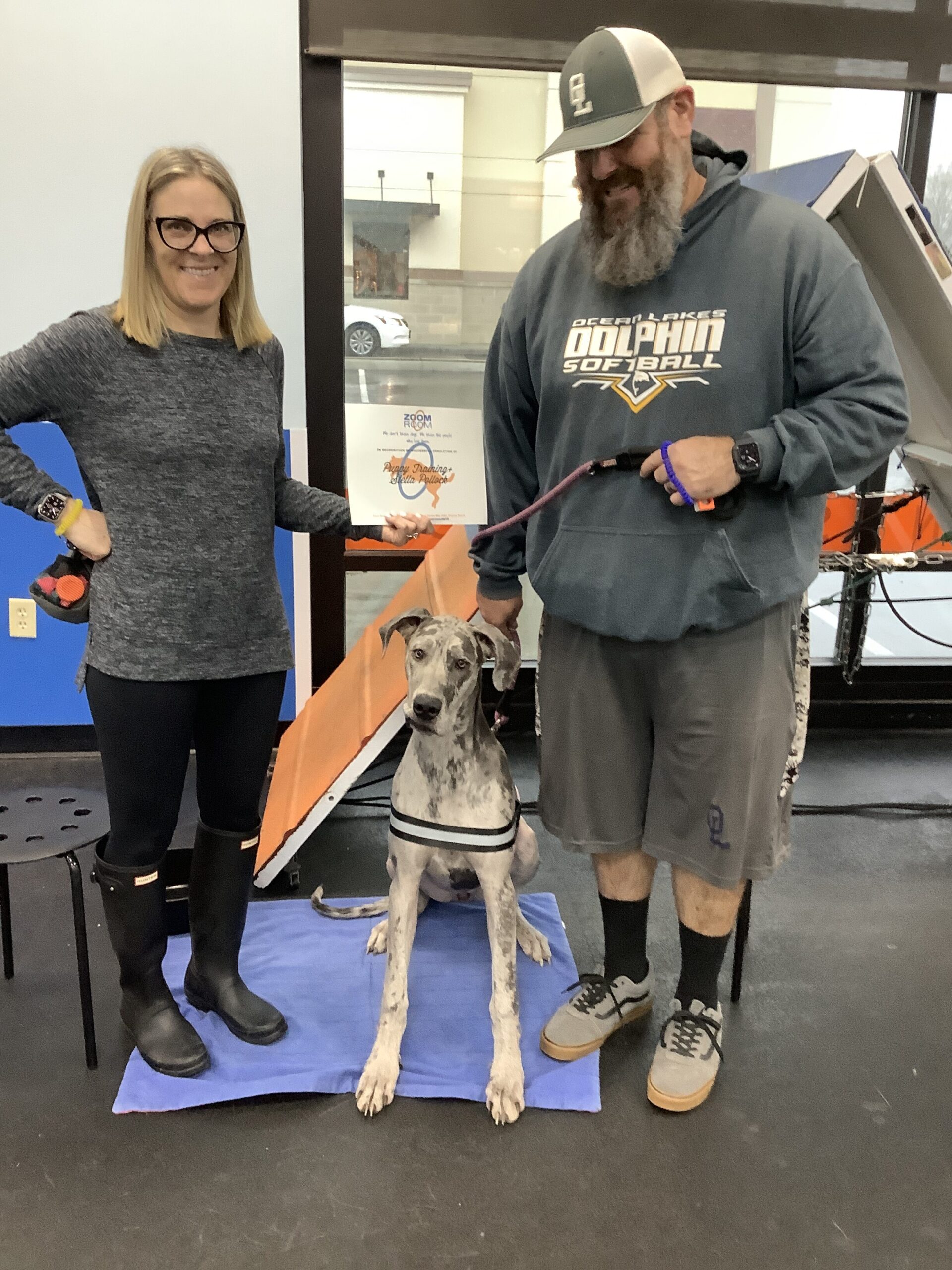 Congratulations Stella! Check out this great photo of Stella, one of the amazing dogs who train at the Zoom Room indoor dog training gym in Virginia Beach.