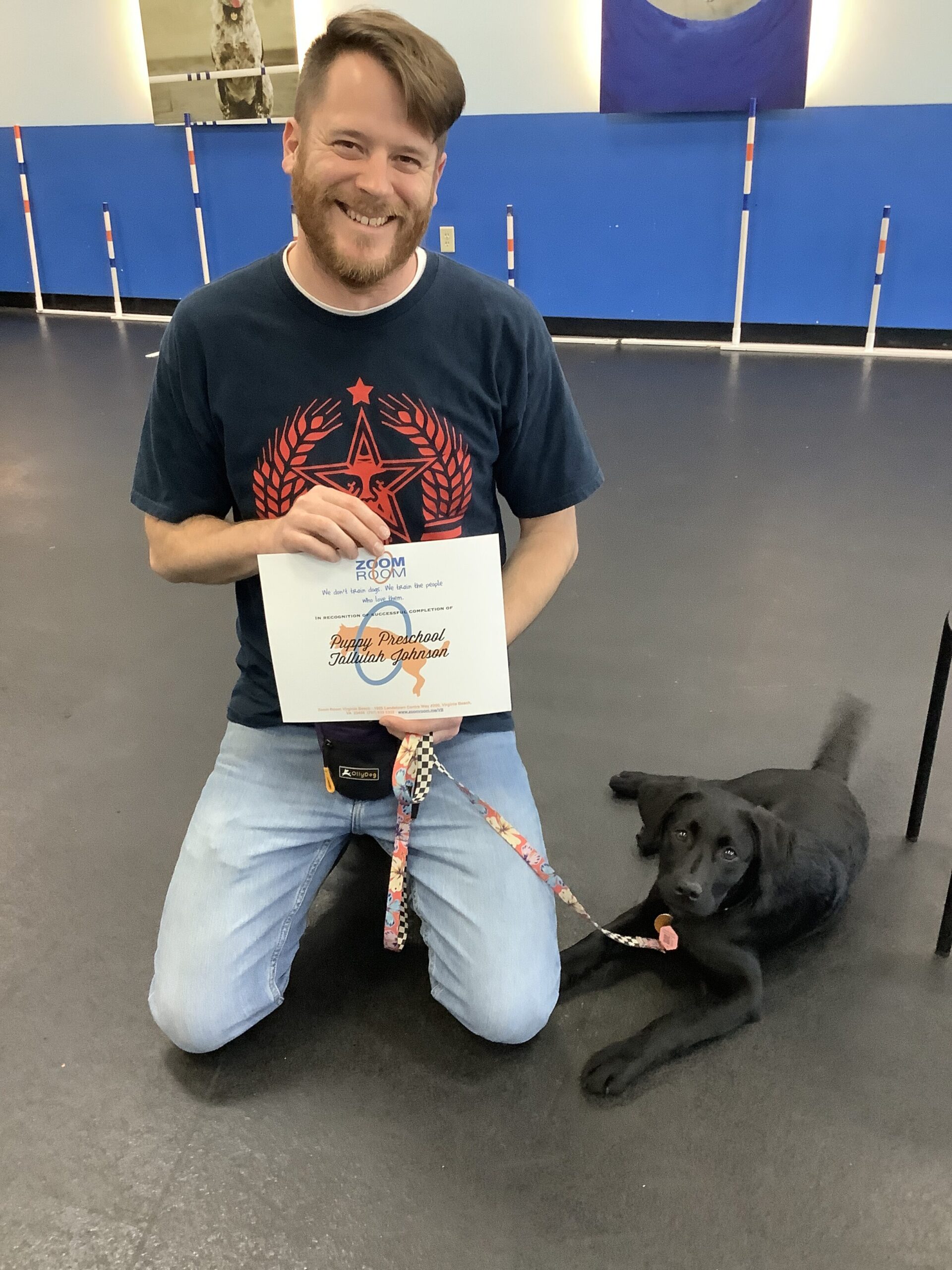 Congratulations! Check out this great photo of Tallulah, one of the amazing dogs who train at the Zoom Room indoor dog training gym in Virginia Beach.