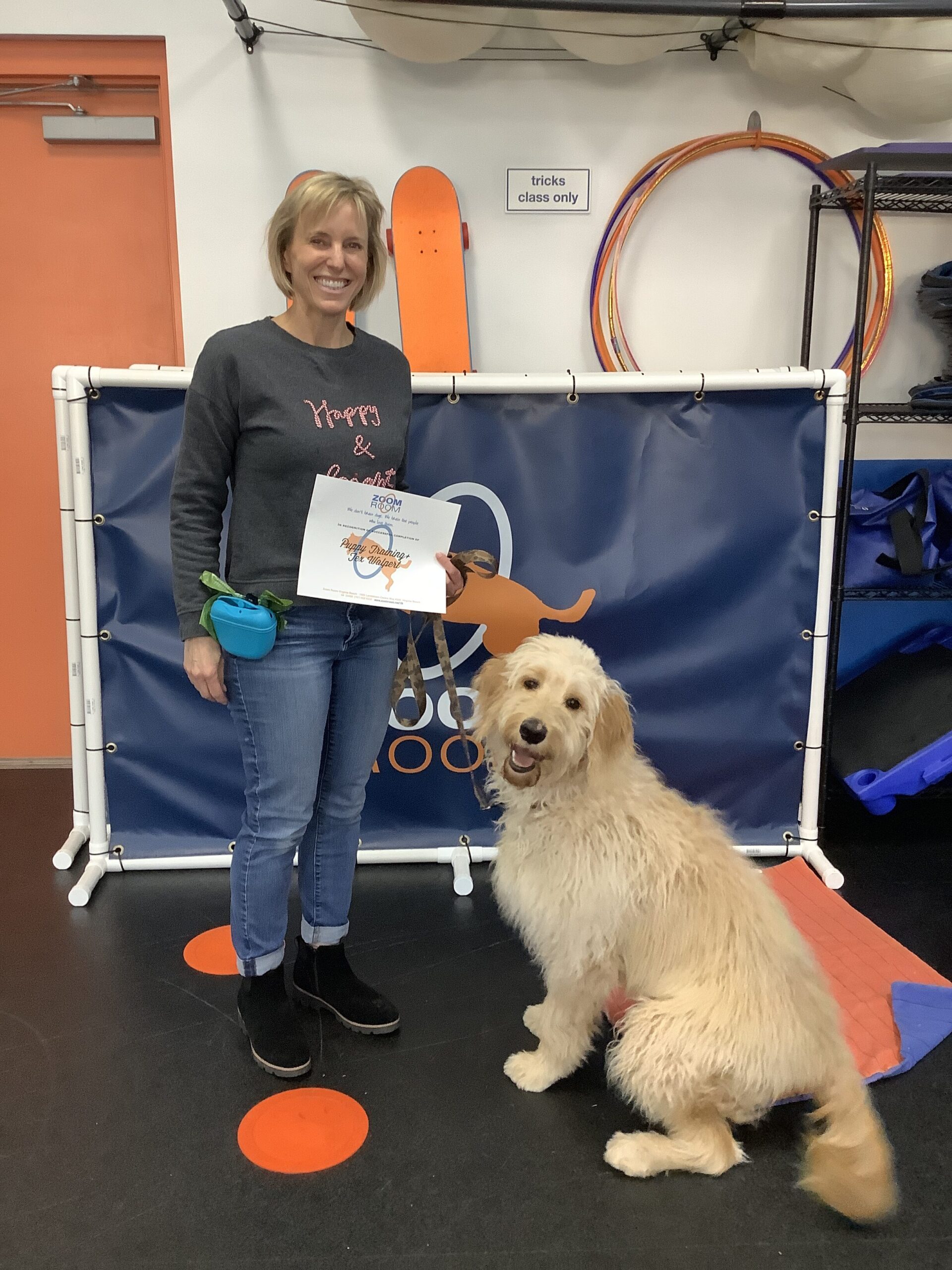 Congratulations Tex!! Check out this great photo of Tex, one of the amazing dogs who train at the Zoom Room indoor dog training gym in Virginia Beach.