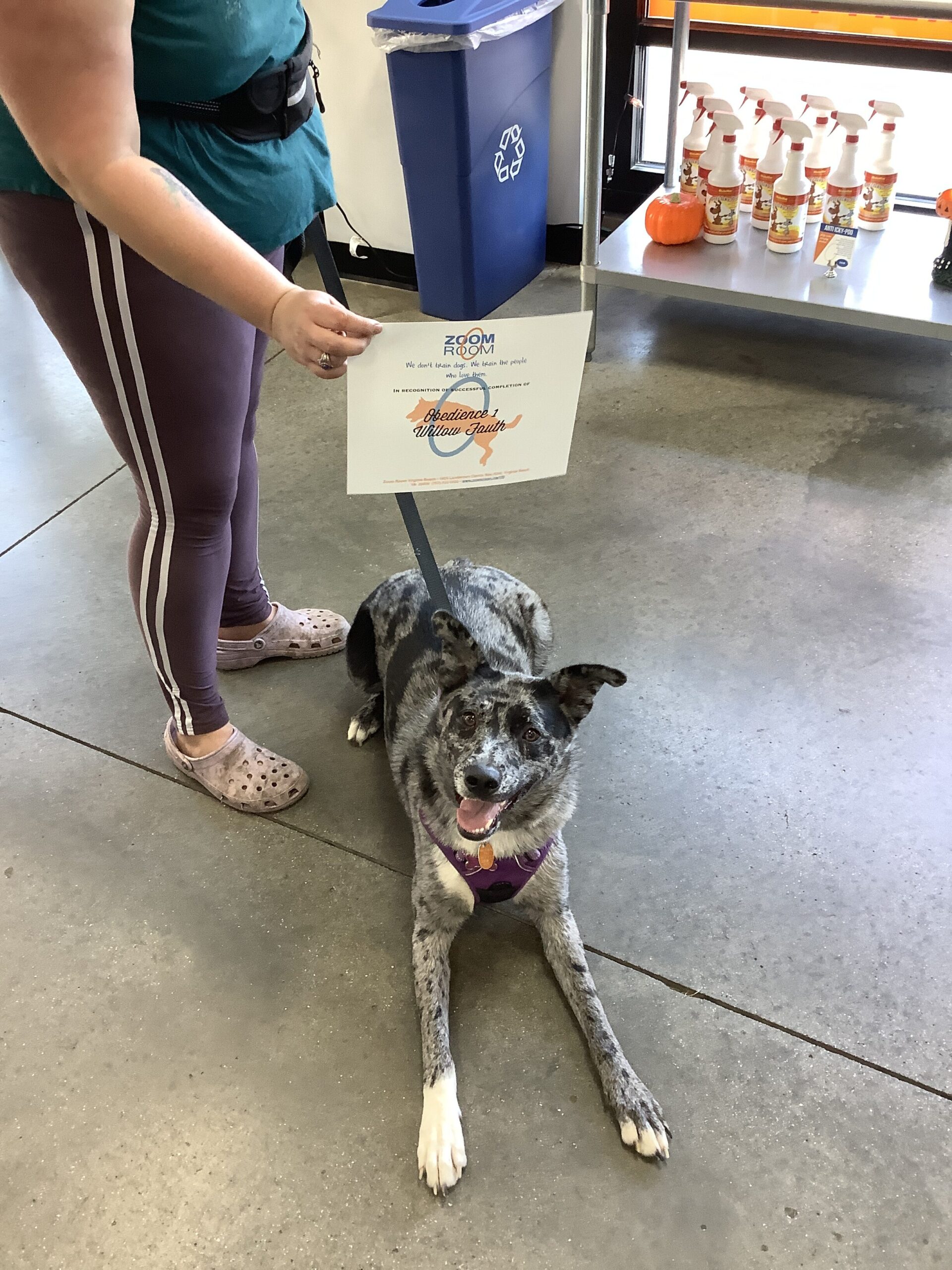 Congratulations Willow on graduating Obedience 1! Check out this great photo of Willow, one of the amazing dogs who train at the Zoom Room indoor dog training gym in Virginia Beach.
