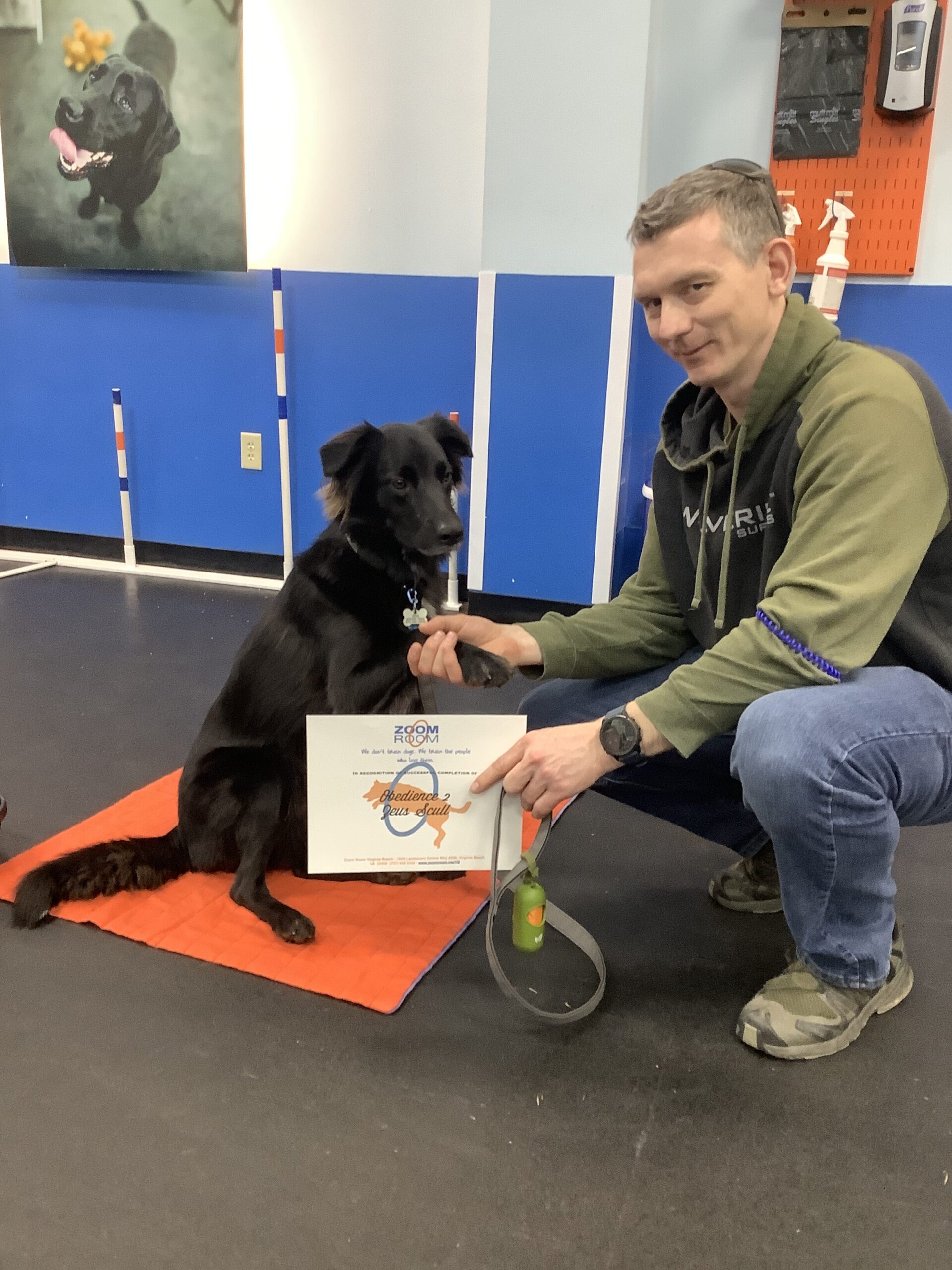 Congratulations Zeus! Check out this great photo of Zeus, one of the amazing dogs who train at the Zoom Room indoor dog training gym in Virginia Beach.