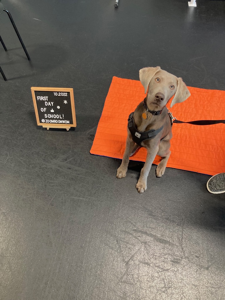 Wyatt’s first day of class! Check out this great photo of Wyatt, one of the amazing dogs who train at the Zoom Room indoor dog training gym in West Des Moines.