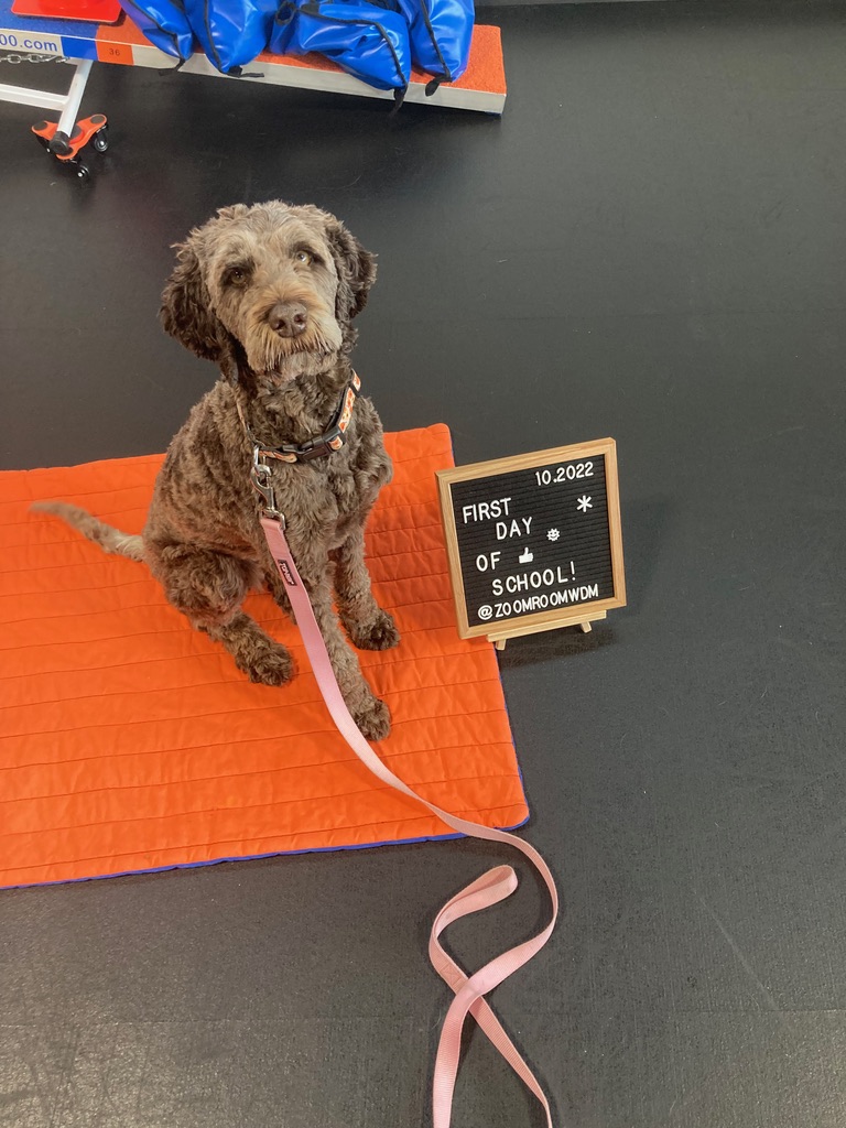 Zuri had so much fun in her first class! Check out this great photo of Zuri V, one of the amazing dogs who train at the Zoom Room indoor dog training gym in West Des Moines.